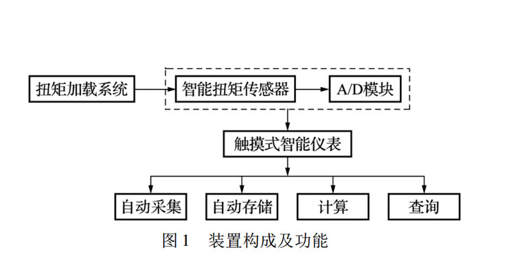 整個(gè)智能型便攜式電動扭矩扳手校準(zhǔn)裝置由扭矩加載系統(tǒng)、智能傳感器和智能儀表等構(gòu)成, 如圖 1所示。自動和手動相結(jié)合的加載方式提高了工作效率,也節(jié)省了人力。智能傳感器采用低成本的 DALLAS2401 半導(dǎo)體芯片, 降低了生產(chǎn)成本, 可實(shí)現(xiàn)自動識別功能。觸摸式智能儀表能實(shí)現(xiàn)峰值自動采集、存儲計(jì)算和查詢功能,可在現(xiàn)場完全取代計(jì)算機(jī)。