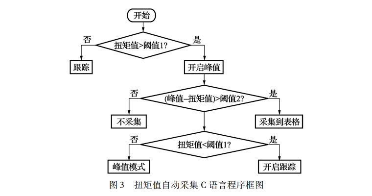 大多數(shù)儀表只具有顯示功能不具有數(shù)據(jù)采集和分析功能,校準(zhǔn)人員在校準(zhǔn)時(shí),一邊操作校準(zhǔn)裝置,一邊用筆記錄校準(zhǔn)數(shù)據(jù)。這樣不但工作效率低還容易出錯。為了方便校準(zhǔn)員做記錄,儀表專門設(shè)計(jì)了數(shù)據(jù)采集功能,采集表格形式完全按照 JGJ707—2014《扭矩扳子檢定規(guī)程》的表格形式[7,這樣方便后面的計(jì)算和出證書。儀表采用具有C語言功能的觸摸屏作為顯示終端。校準(zhǔn)人員可以通過設(shè)定最大扭矩值和采集觸發(fā)值, 實(shí)現(xiàn)扭矩值的自動采集。并根據(jù)采集數(shù)據(jù)進(jìn)行平均值和示值相對誤差和示值重復(fù)性的計(jì)算。C 語言程[8]框圖如圖3 所示。其中閾值1表示進(jìn)入峰值模式的判斷條件,閾值2表示采集峰值判斷條件。當(dāng)扭矩值超過閾值 1,儀表自動從跟蹤模式變?yōu)榉逯的J?。?dāng)峰值和當(dāng)前的扭矩值之差大于閾值 2 時(shí),程序會將峰值自動采集到表格中,然后解除峰值功能。閾值1和2的設(shè)定根據(jù)智能傳感器的量程來計(jì)算得到。本設(shè)備中閾值1為傳感器滿量程值的5%,閾值2為滿量程值的2/3。
