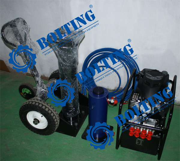 為河南某重工企業(yè)定制的移動式液壓駕車機、汽油發(fā)動機動力液壓泵、雙作用液壓千斤頂準備發(fā)貨