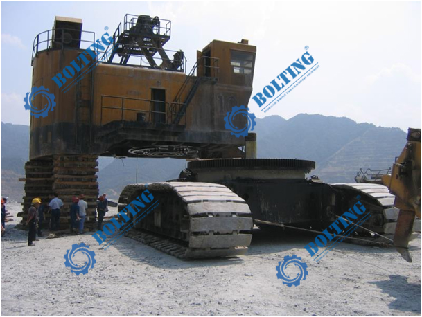 電鏟是千萬噸級露天礦山主要采掘設備之一,生產率高,作業(yè)率高,操作成本低,是目前采礦業(yè)公認的機型。電鏟由行走裝置、回轉裝置、工作裝置、潤滑系統(tǒng)、供氣系統(tǒng)組成。鏟斗是電鏟的主要部件,它直接承受被挖掘礦石的作用力,因而磨損較大,斗桿也是電鏟挖掘過程中的主要部件之一,它的作用是連接和支持鏟斗,并將推壓作用傳送給鏟斗,鏟斗在推壓和提升力的共同作用下完成挖掘土壤的動作;其行走機構中最為核心的履帶裝置,經過相關的傳動機構最終使其在地面直接移動!