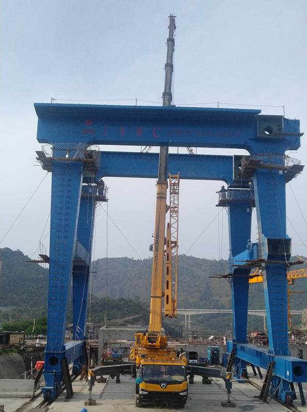 該門式啟閉機為2×800/600/600千牛雙向門機,總重約382噸,主要由小車、門架、大車行走機構(gòu)、左右回轉(zhuǎn)吊等結(jié)構(gòu)組成;本次進水塔雙向門機是卡洛特水電站安裝的首臺永久啟閉設(shè)備,主要用于進水塔閘門、攔污柵的安裝及清污。