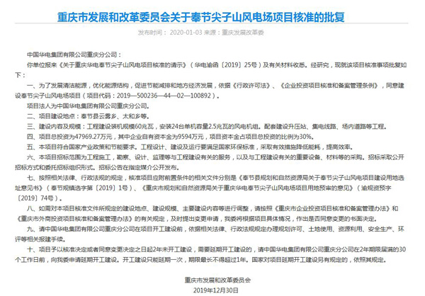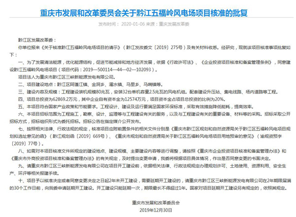 2019年12月30日,重慶市新核準(zhǔn)三個(gè)風(fēng)電項(xiàng)目,分別是奉節(jié)尖子山風(fēng)電場項(xiàng)目、武隆區(qū)四眼坪風(fēng)電場二期項(xiàng)目、黔江五福嶺風(fēng)電場項(xiàng)目。三個(gè)項(xiàng)目總?cè)萘拷咏?00MW。